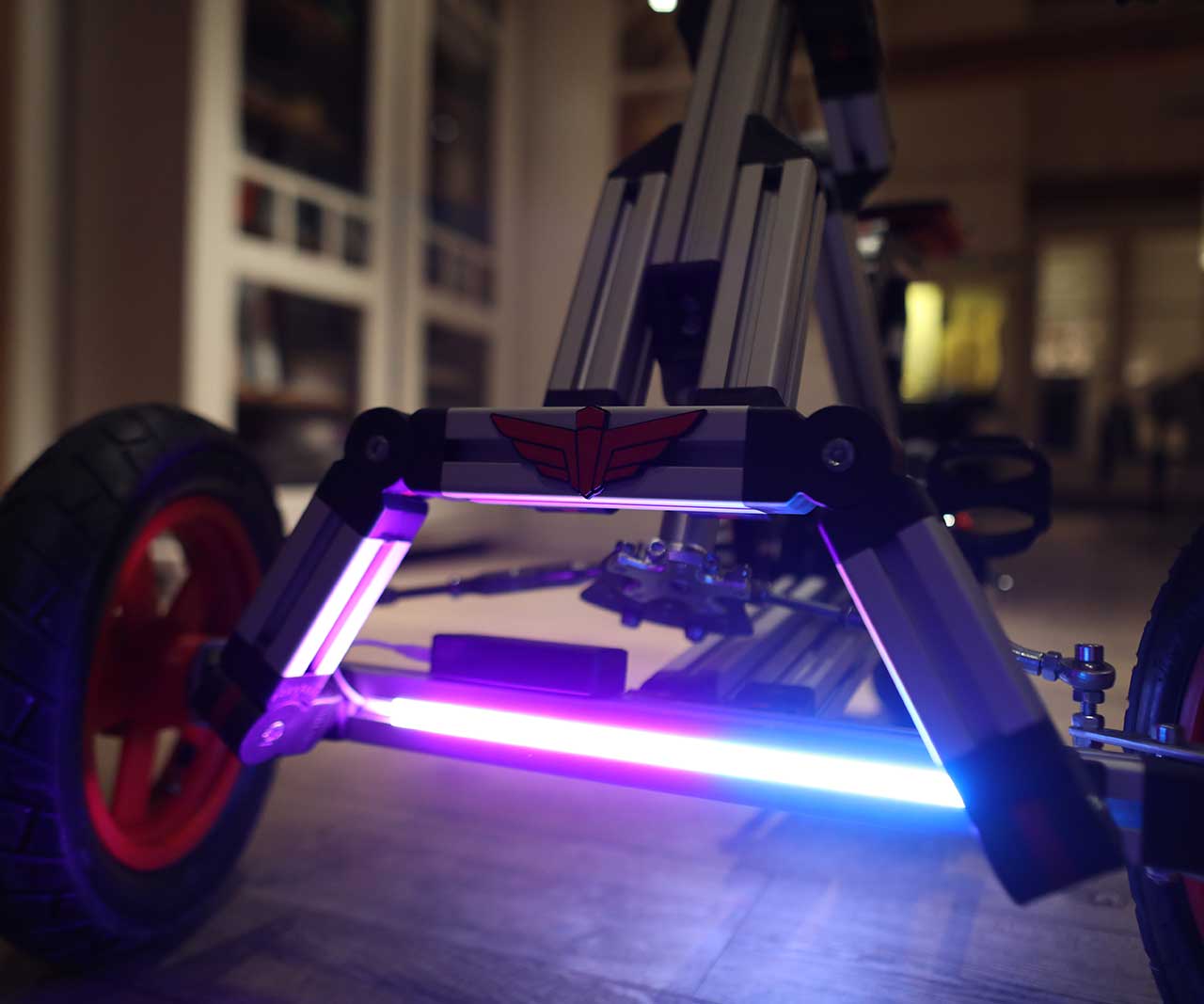 LED there be light! Add a 30cm LED strip with remote-controlled colors and effects. Powered by a rechargeable powerbank for 6 hours, it even charges your phone. Click and Ride in style!
